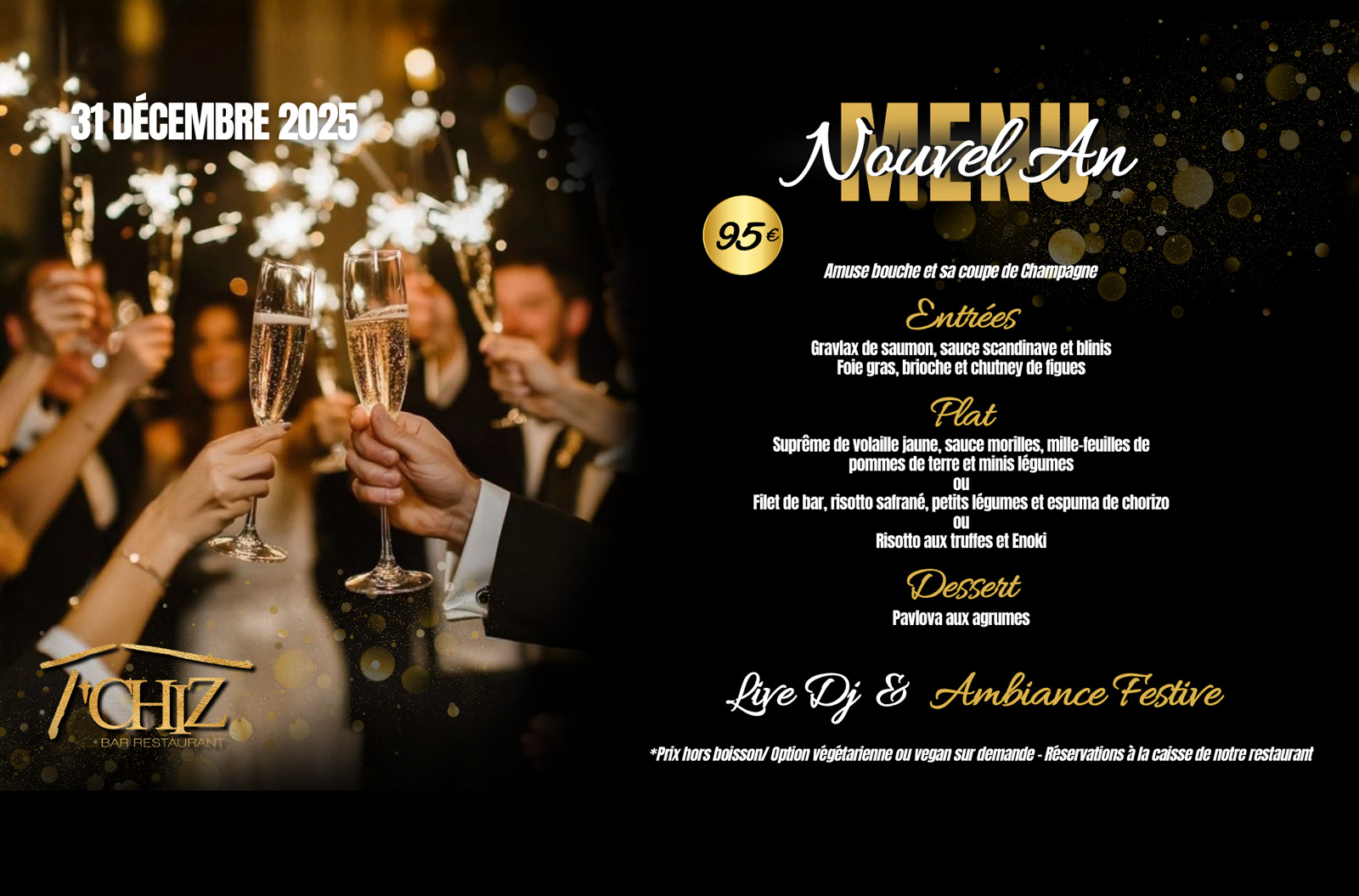 Le T’Chiz vous attend pour fêter ensemble le réveillon de la Saint Sylvestre le 31/12/2025 dans une ambiance festive, avec animation Dj !